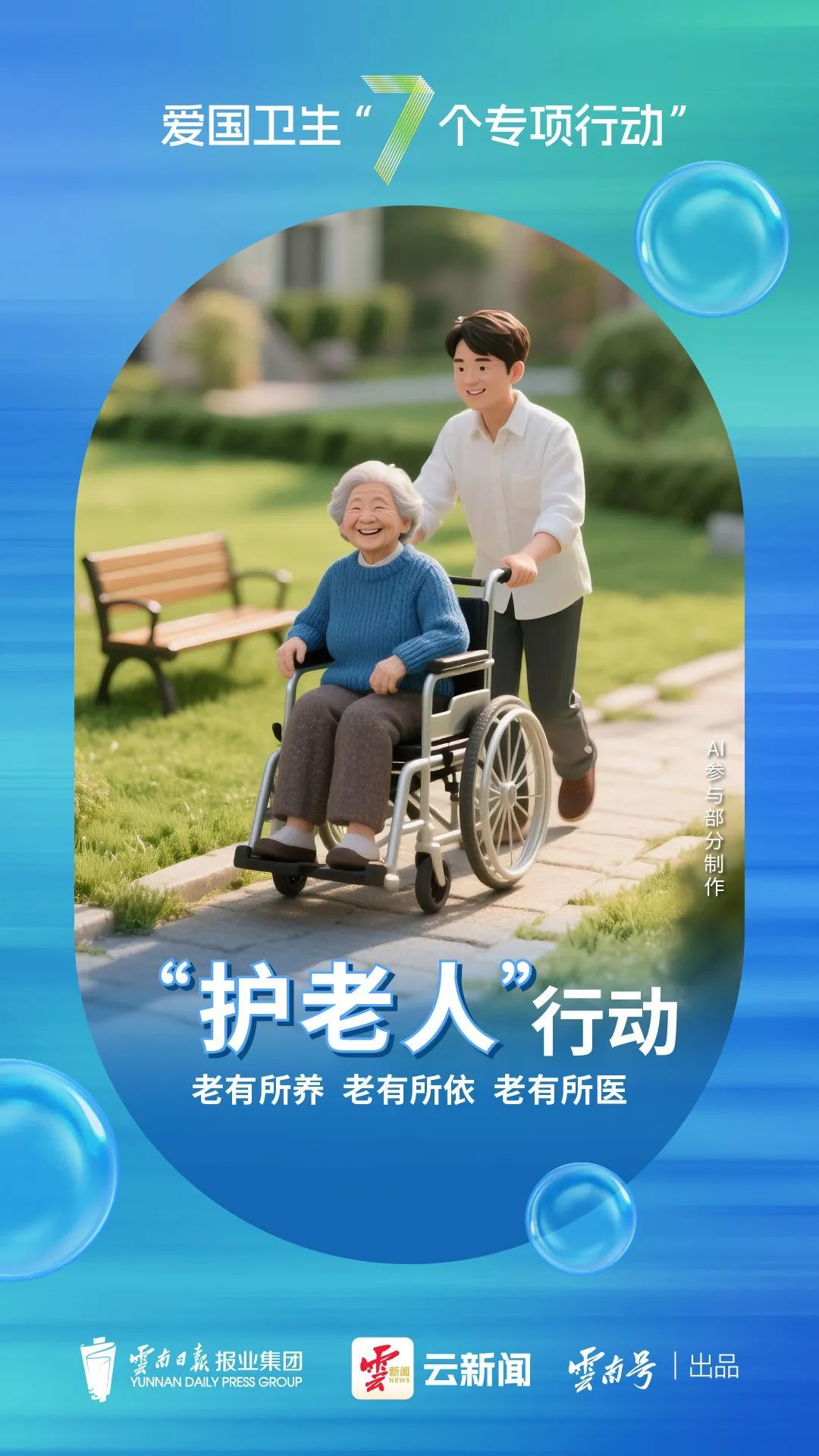 聚焦老年人旅居康养、生活照料、健康服务和权益保障等急难愁盼问题,优化服务供给,推进“七彩云南·养老福地”建设,构建老年友好型社会。推进机构照护服务,每个县(市、区)至少有1所养老机构可提供失能照护服务,有区域养老服务中心的乡镇(街道)覆盖率不低于65%,实现老有所养。推进社区照护服务,城市社区养老服务中心覆盖率不低于90%,每年为65岁以上老年人免费健康体检1次。推进居家照护服务,对特困供养的失能、高龄、残疾老年人家庭实施居家适老化改造,根据需求提供助餐、助洁、助浴、助医、助急、助行等多样化服务,实现老有所依。推进医养结合,深化医疗卫生机构与养老机构协议合作,二级及以上公立综合医院设立老年医学科的占比不低于90%,实现老有所医。