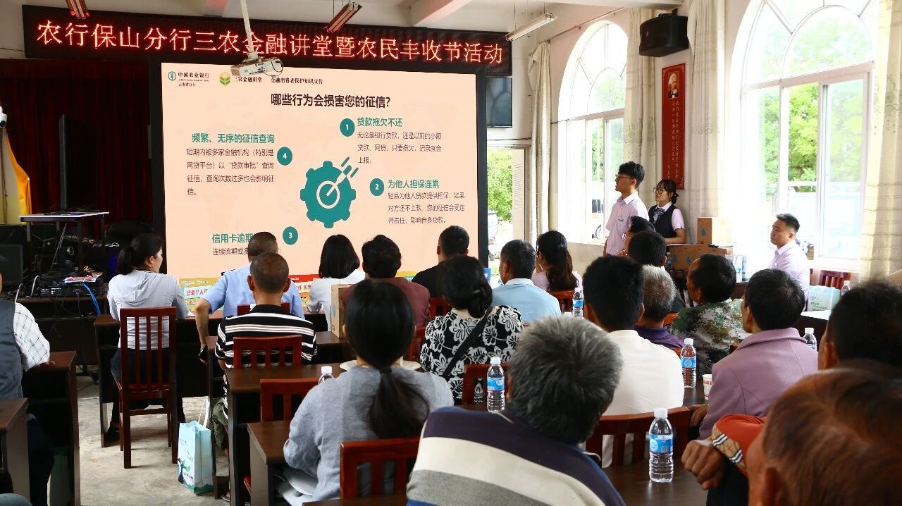 在第八个中国农民丰收节到来之际,仁和镇五楼村邀请到了中国农业银行保山施甸支行到村开展“三农金融讲堂暨农民丰收节活动”,本次活动聚焦农民朋友关心的金融知识普及、惠农政策解读和电信诈骗防范等内容,为村民带来了一场实用、生动、温暖的金融服务盛宴。