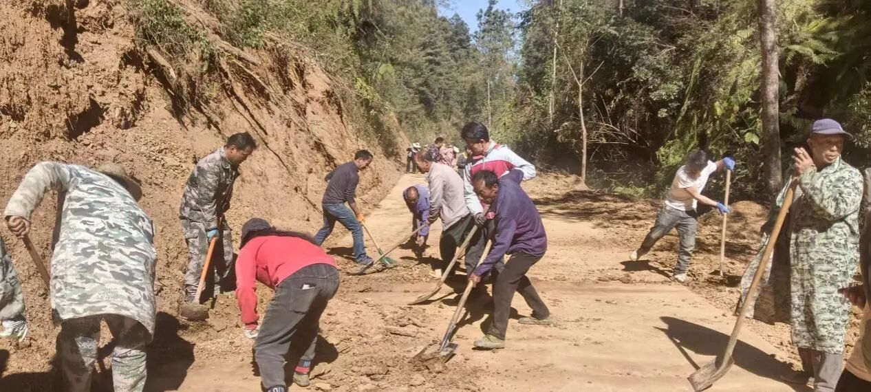 在道路提质工程现场,党旗高高飘扬,实干彰显担当。村“两委”与驻村工作队主动靠前,精准测算施工需求,在挂联单位的关心帮助下,多方协调筹措,统筹调配150吨水泥等关键建材,全力保障施工用料;村党总支带头冲锋,党员干部以身作则、率先垂范,扛铁锹、拌混凝土、清路基,成为建设一线的“主心骨”;广大村民热情高涨、踊跃参与,自发组建施工队伍,不计报酬、不分昼夜投身建设,从路基清理到路面浇筑,从养护抹面到挡墙支砌,每一个环节都凝聚着党群同心的汗水。